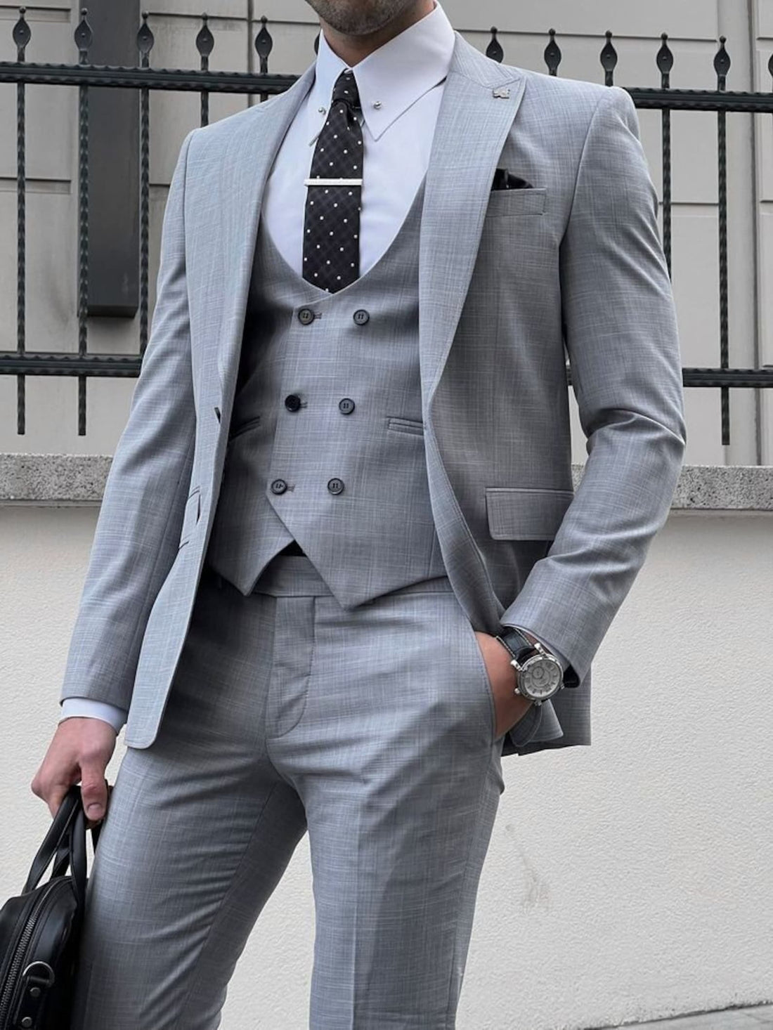 Madhu Couture Grey Designer Formal Fashion Wedding 3 Piece Groom Party Wear Coat Vest Pant Suit For Men.