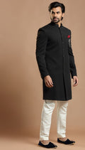 Madhu Couture Black Indo Indian Stylish Ethnic Traditional Partywear Marriage Wedding Sherwani Groom Outfit For Men.