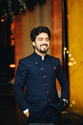 Madhu Couture Designer Blue Coat Bandhgala Jodhpuri Self Design Work Party Wear Wedding Suit for Men.