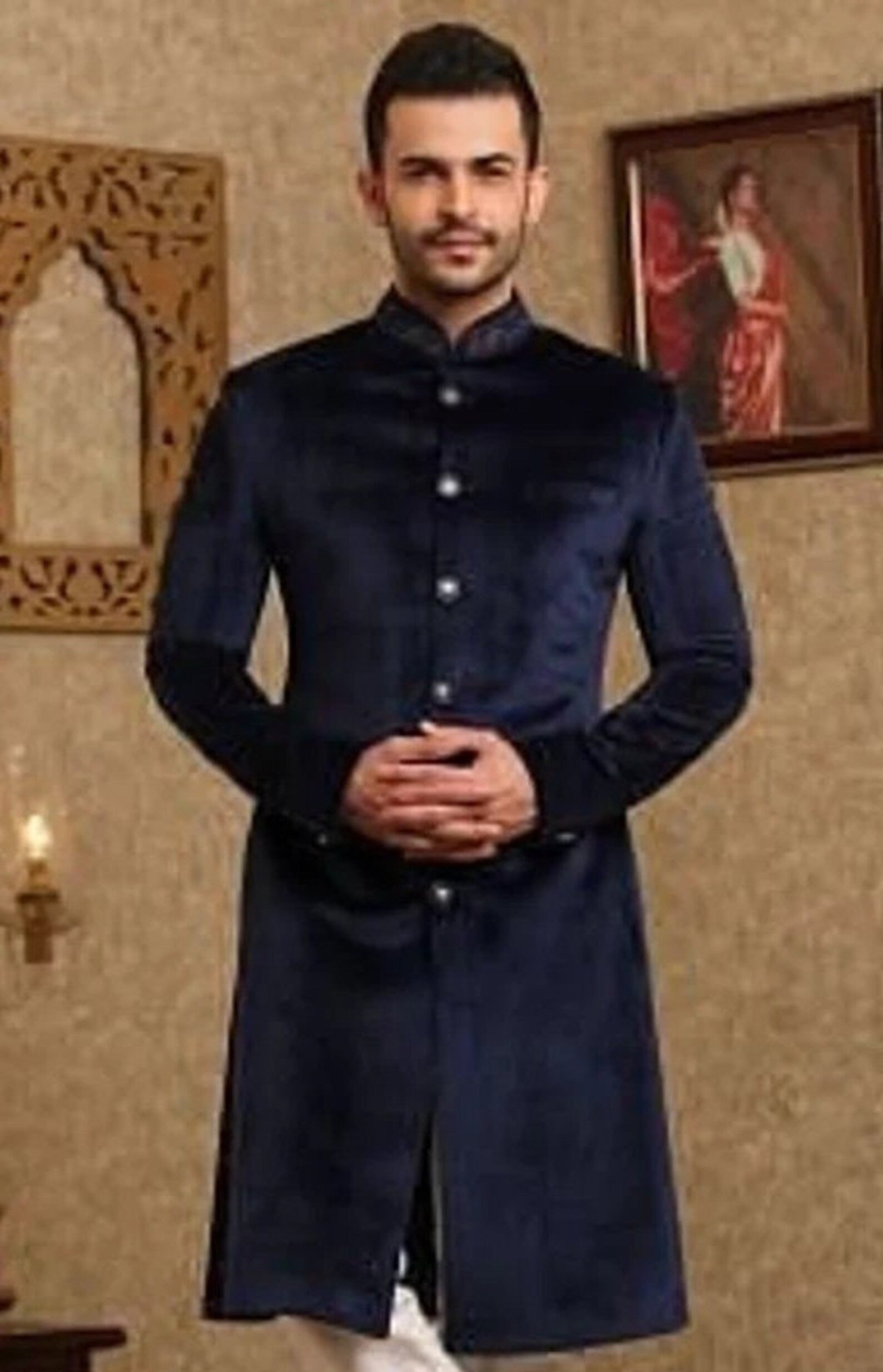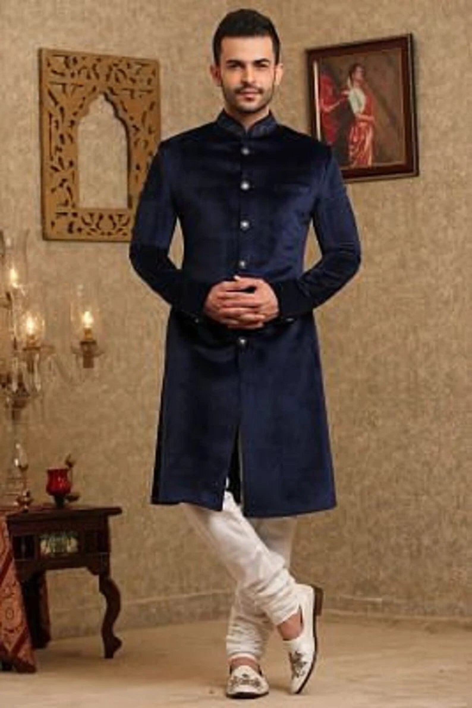 Madhu Couture Indian Ethnic Navy Blue Velvet Designer Party Wear sherwani bandhgala For Men.