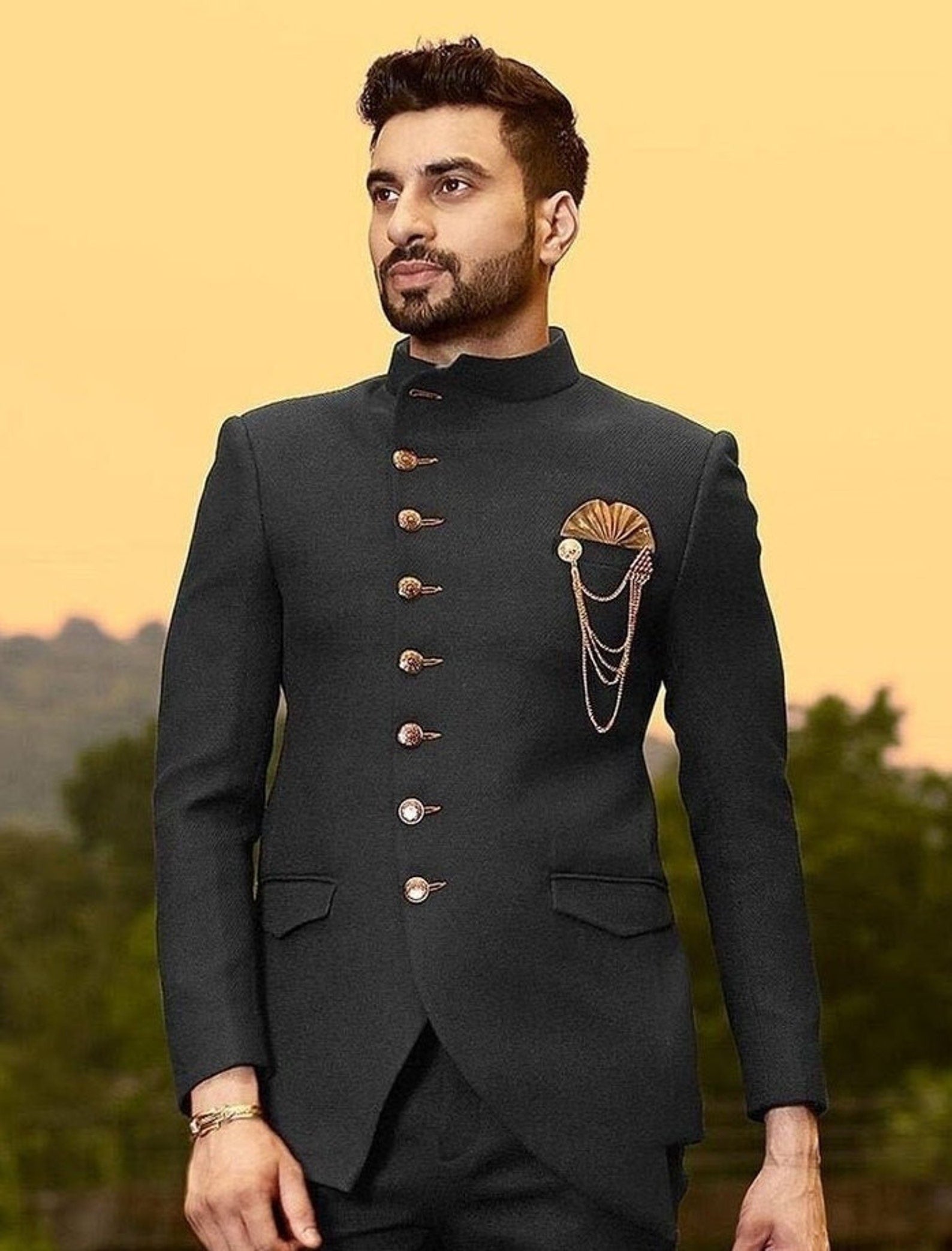Madhu Couture Indian Stylish Ethnic Designer Partywear Black Bandhgala Jodhpuri Suit For Men.